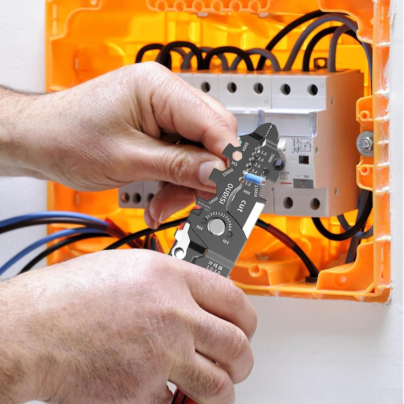 2: 【Practical Multi-function Tool】This practical and multifunctional cable stripping cutter meets various electrician operation requirements such as wire cutting, stripping, crimping, winding, splitting, clamping, wrenching, etc.