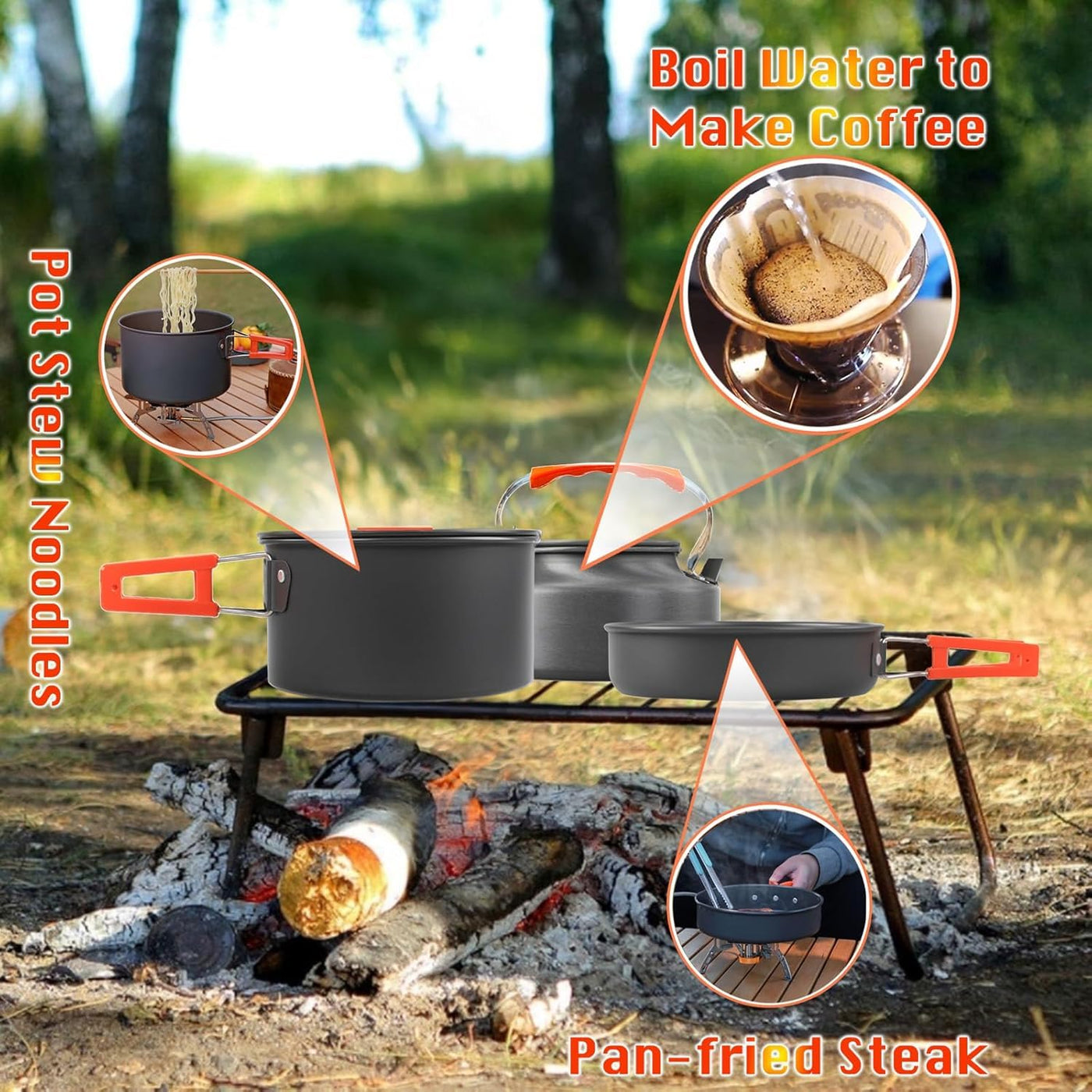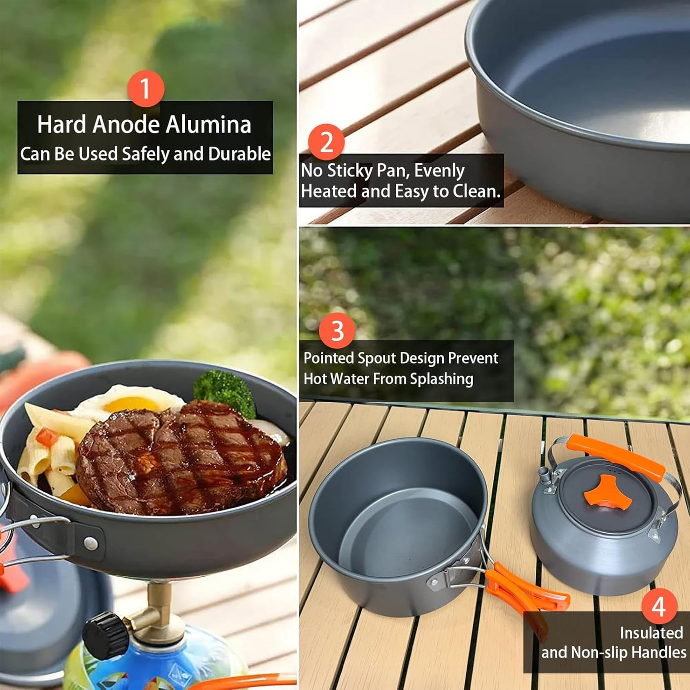 - BUILT TO LAST HIGHEST QUALITY/EASY CLEAN CAMPING COOKWARE: Hard anodized aluminum pot and frying pan make it non-stick ,easy to clean.