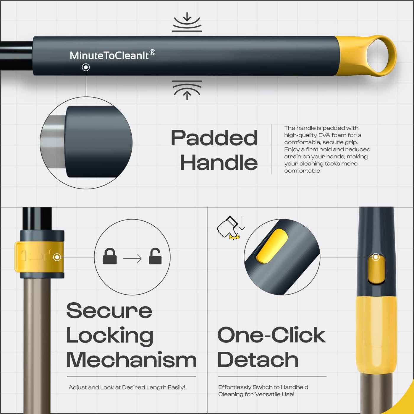 MinuteToCleanIt Bathroom Cleaning Brush with Long Handle, Hard Bristles, Microfiber Pad & Scrubber Combo for Tiles, Floor, Toilet, Window & Glass - 58.2 Inch Extendable Pole, Detachable Head, Yellow