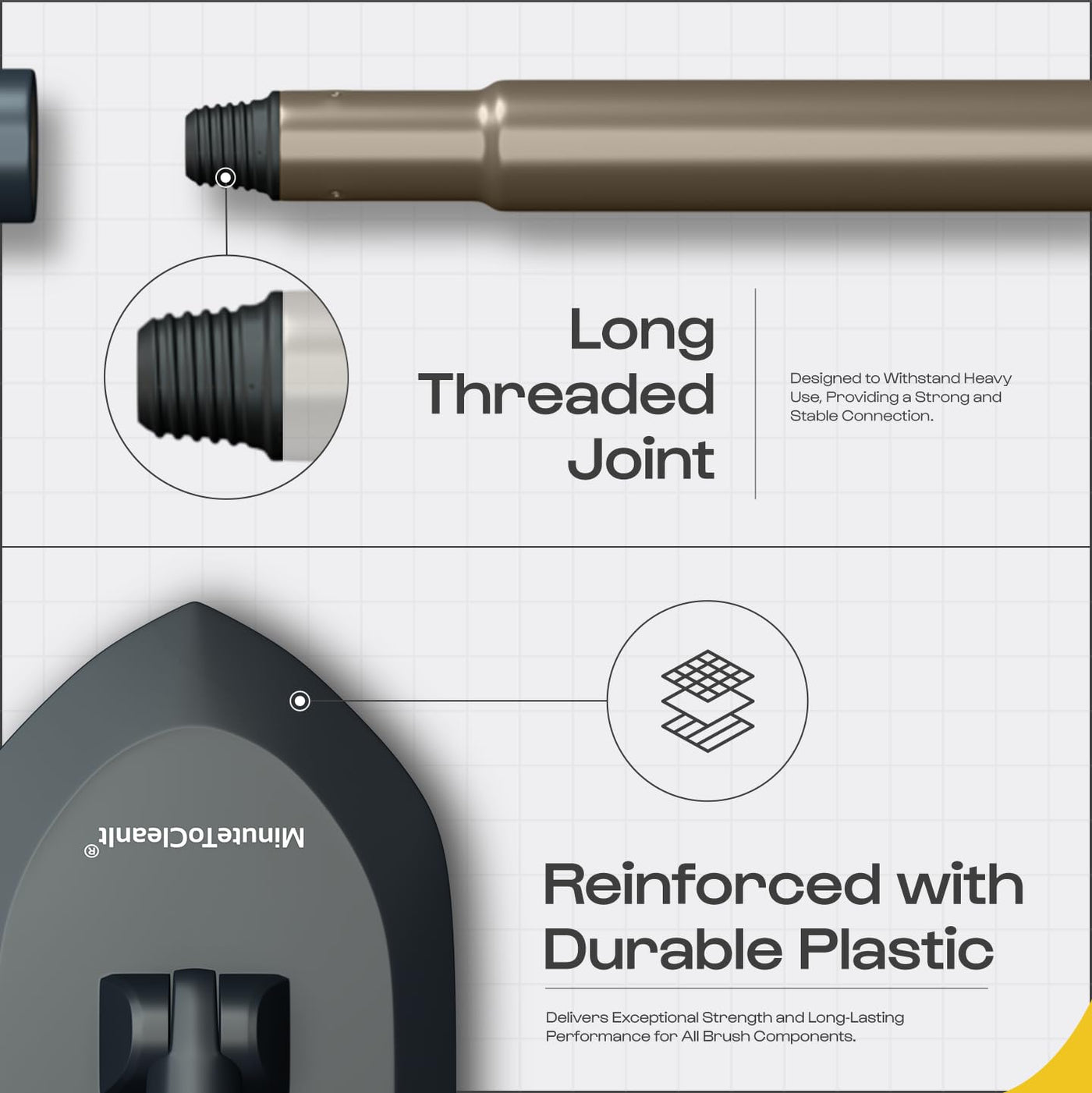 A Real Tough Brush and Not Gimmick -- The MinuteToCleanIt bathroom wall tiles cleaning brush scrubber is made of high-quality PP material, Stainless Steel and iron while threaded joints tighten the rods with firm locking. The padded handle provides a soft, non-slip and comfortable grip, making it easy to hold even when wet. When cleaning is done, you can hang your bathroom scrubber on the wall using the utility hook, keeping clutter to a minimum